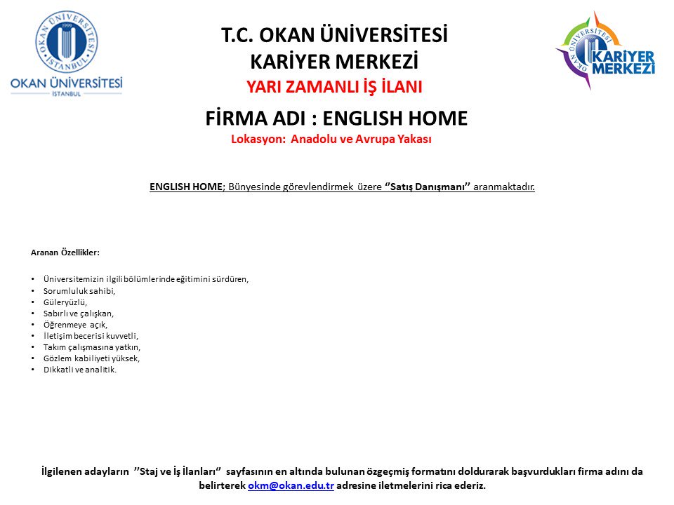 Okan Kariyer Merkezi On Twitter English Home Yari Zamanli Is Ilani Satis Danismani