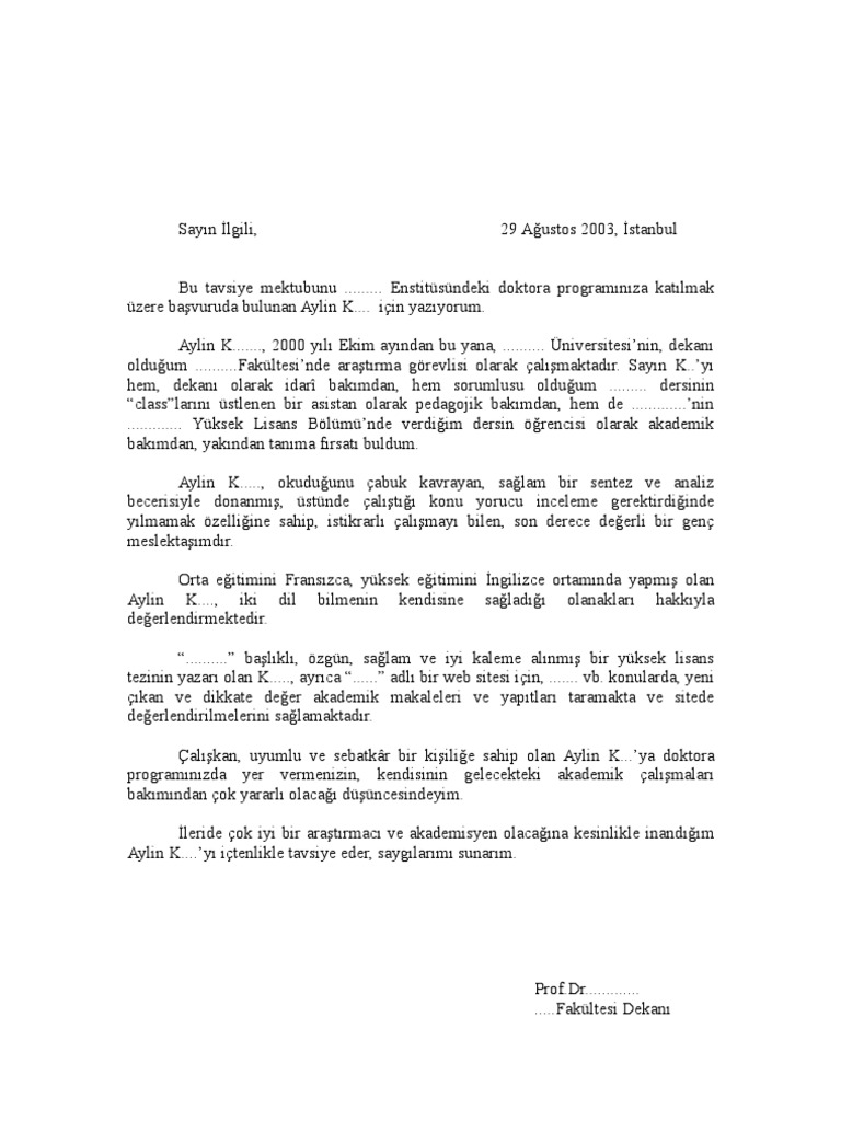 Ogretim Gorevlisinden Referans Isteme Mektubu