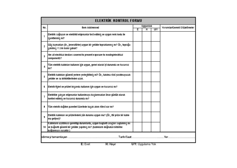 Yuksek Gerilim Isletme Sorumlulugu Ornek Periyodik Kontrol Formu