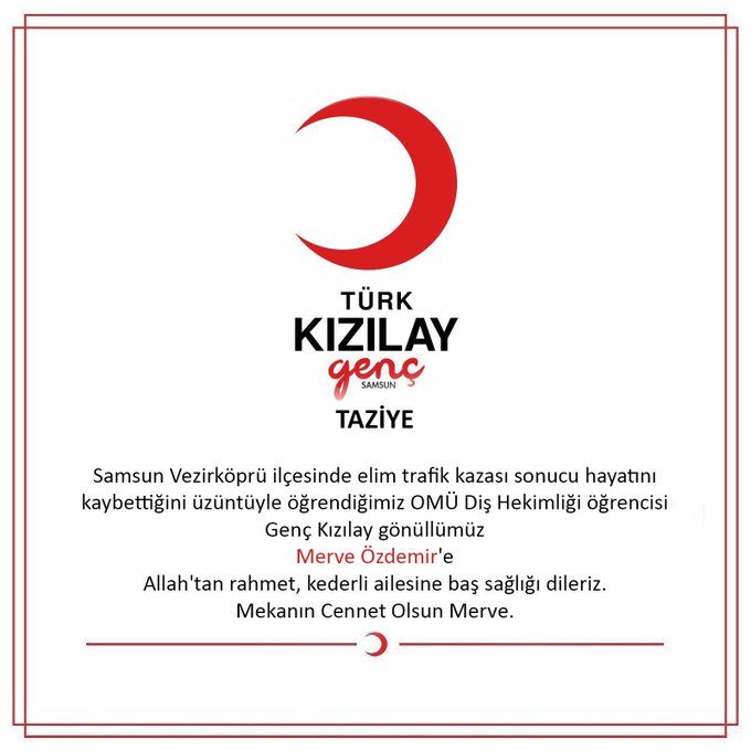 Genc Kizilay Samsun On Twitter Samsun Vezirkopru Ilcesinde Elim Trafik Kazasi Sonucu Hayatini Kaybettigini Uzuntuyle Ogrendiginiz Dis Hekimligi Bolumunde Okuyan Genc Kizilay Gonullumuz Merve Ozdemir E Allah Tan Rahmet Kederli Ailesine Bas Sagligi