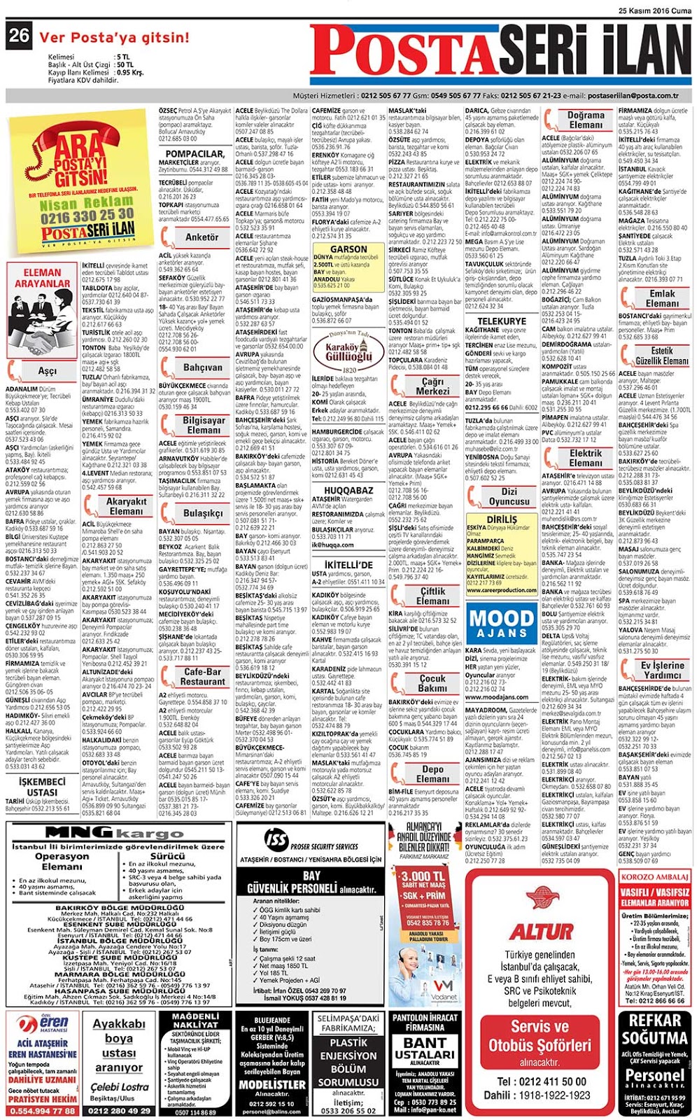 Posta Seri Ilan Posta Gazetesi Is Eleman Seri Ilanlar Sayfasi Posta Bugunku Seri Ilanlar 26 Kasim 2016 Cumartesi