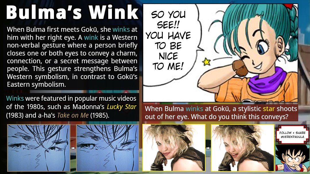 Derek Padula On Twitter When Bulma First Meets Goku She Winks At Him A Wink Is A Western Non Verbal Gesture Where A Person Briefly Closes One Or Both Eyes To Convey A